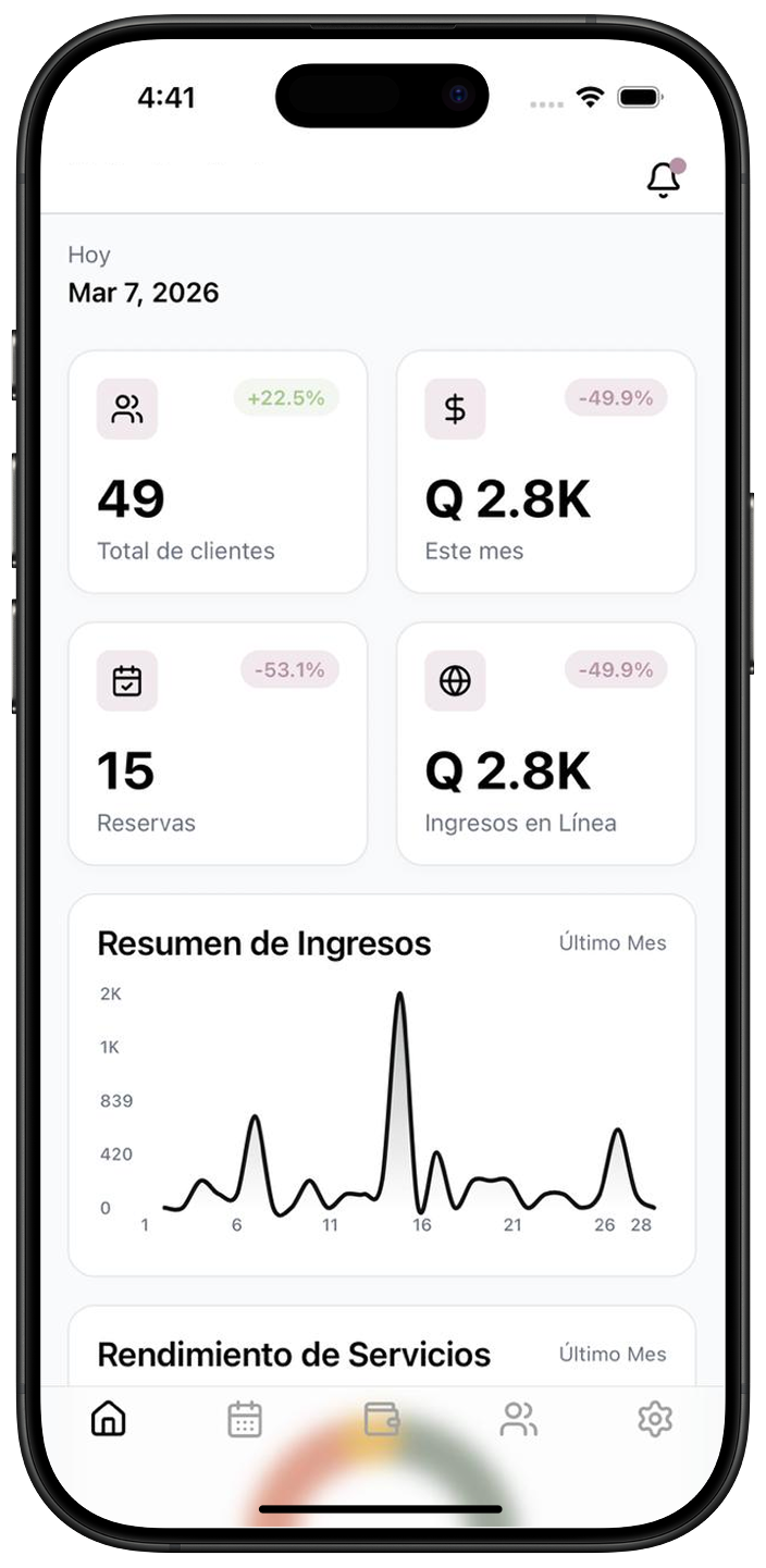 Registra pagos, envía enlaces de cobro, genera facturas electrónicas automáticamente y visualiza el flujo financiero completo de tu negocio. Desde cada cita hasta el reporte mensual.